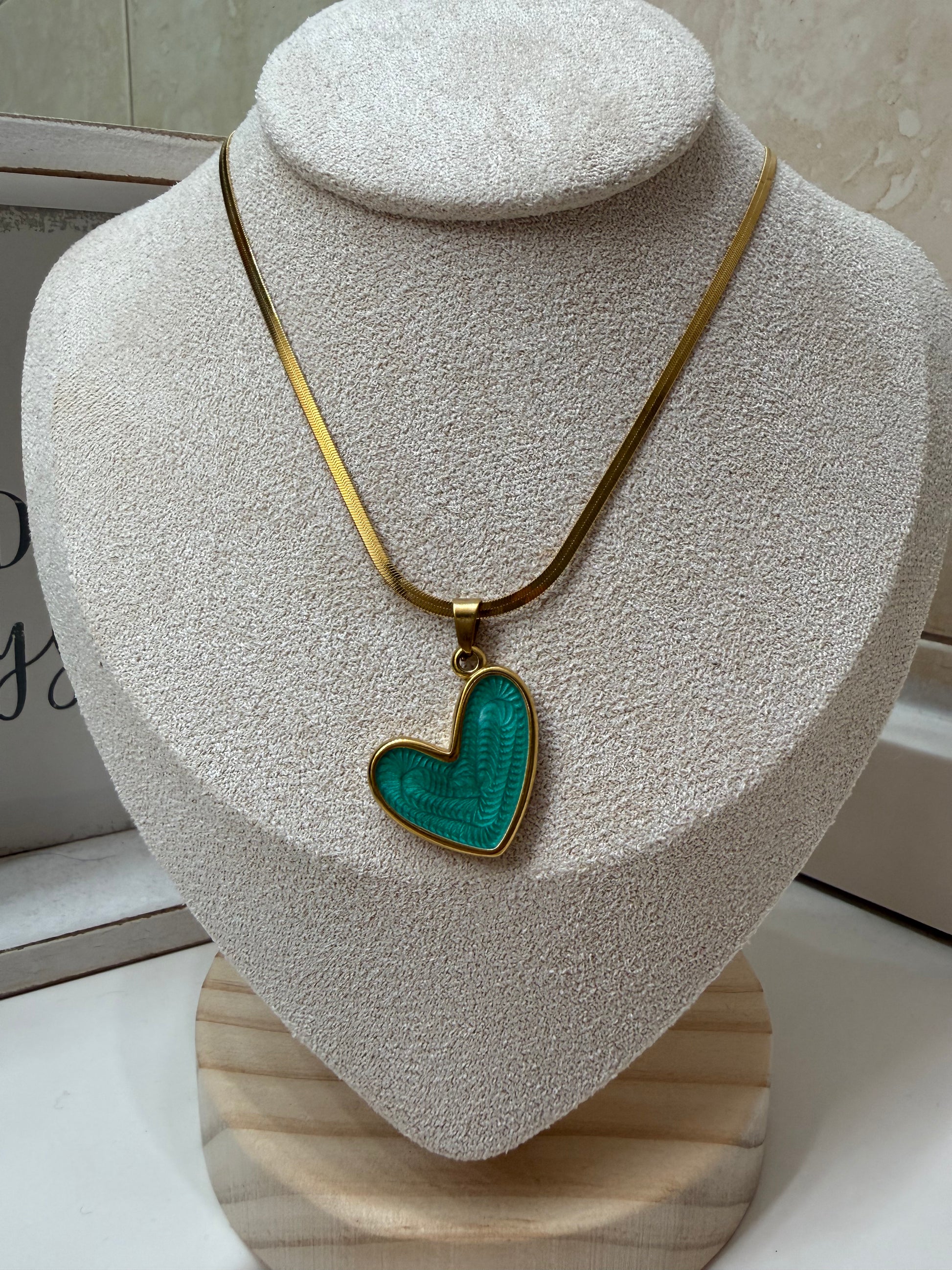 Collar en acero inoxidable, enchapado en oro 18k con charm en forma de corazón. Corazón en material enamel, esto es un collar de excelente durabilidad.
