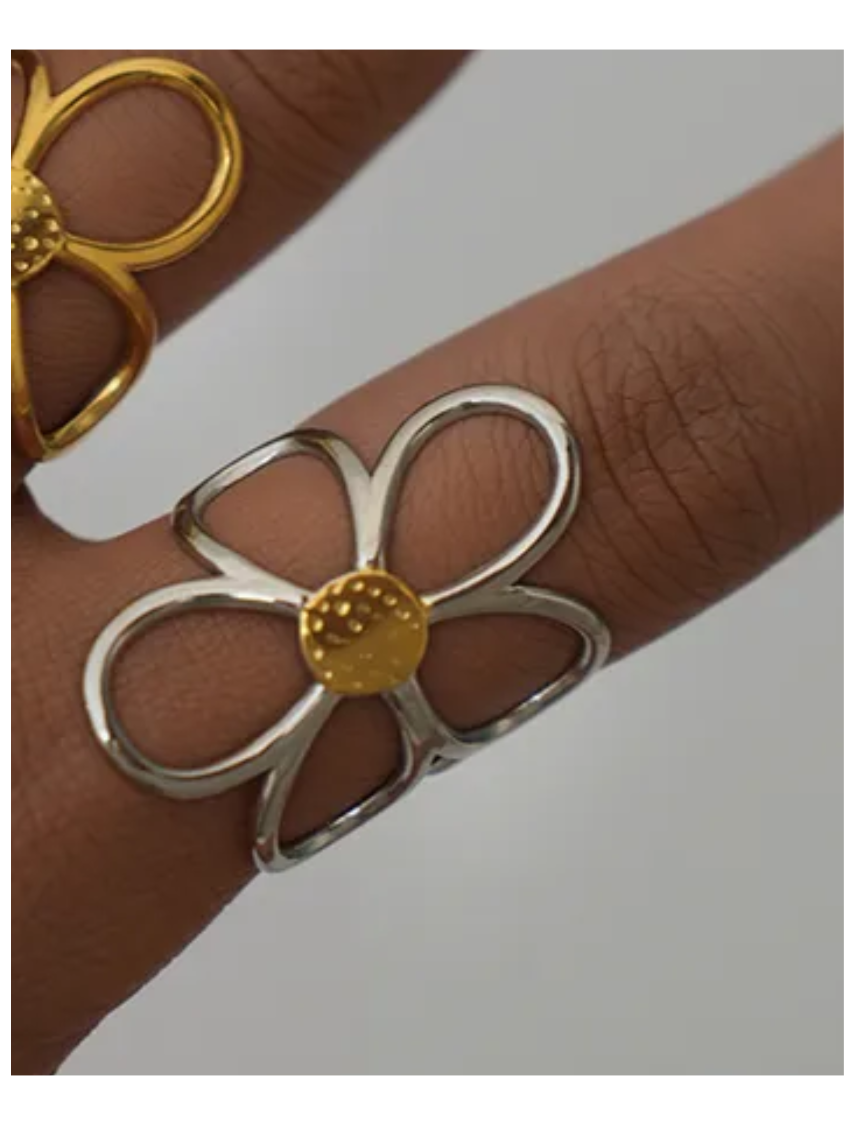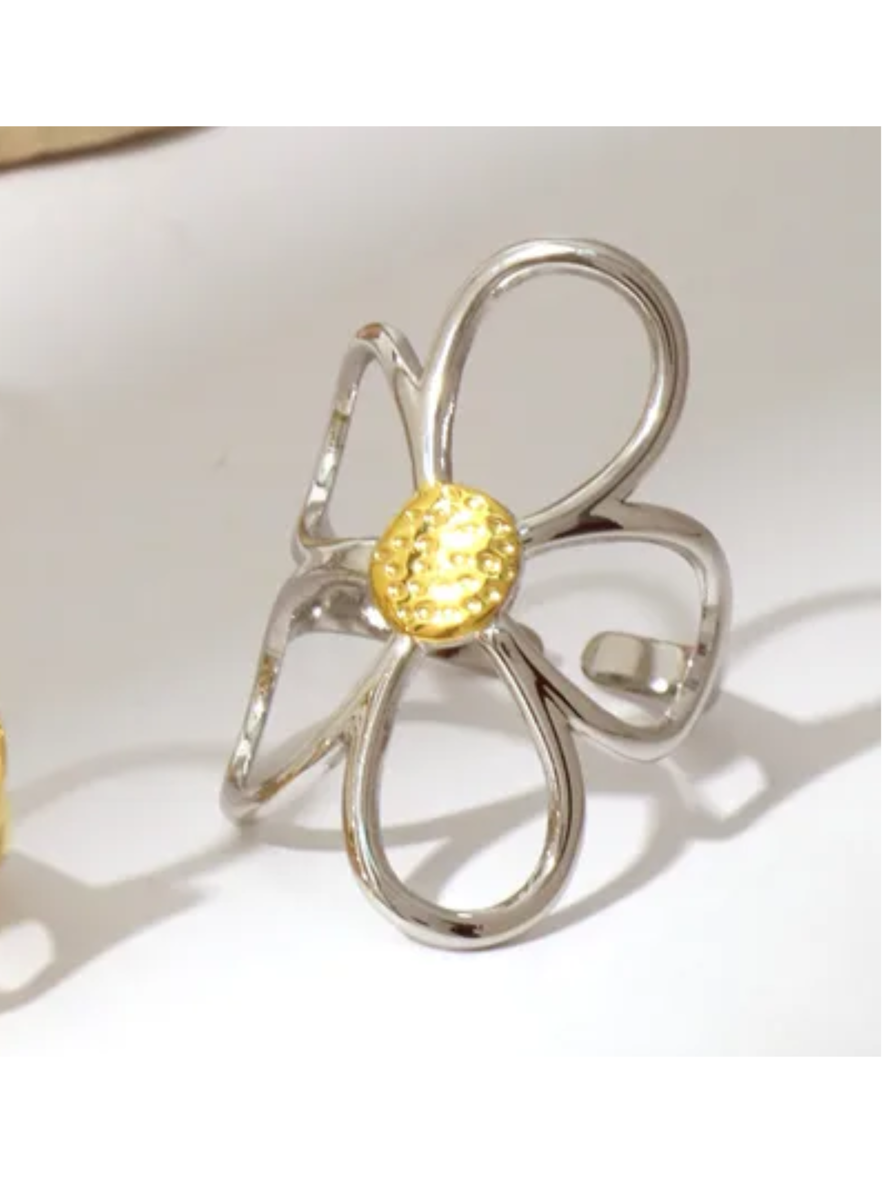 Sortija en acero inoxidable 304 con chapado en oro de 18K. Su diseño floral y tamaño ajustable la hacen perfecta para brillar entre semana o en tus planes de fin de semana.