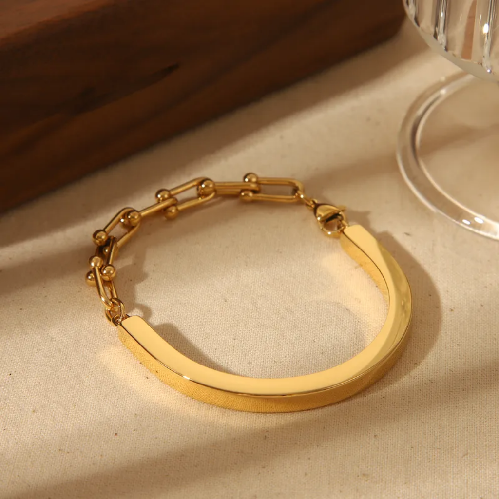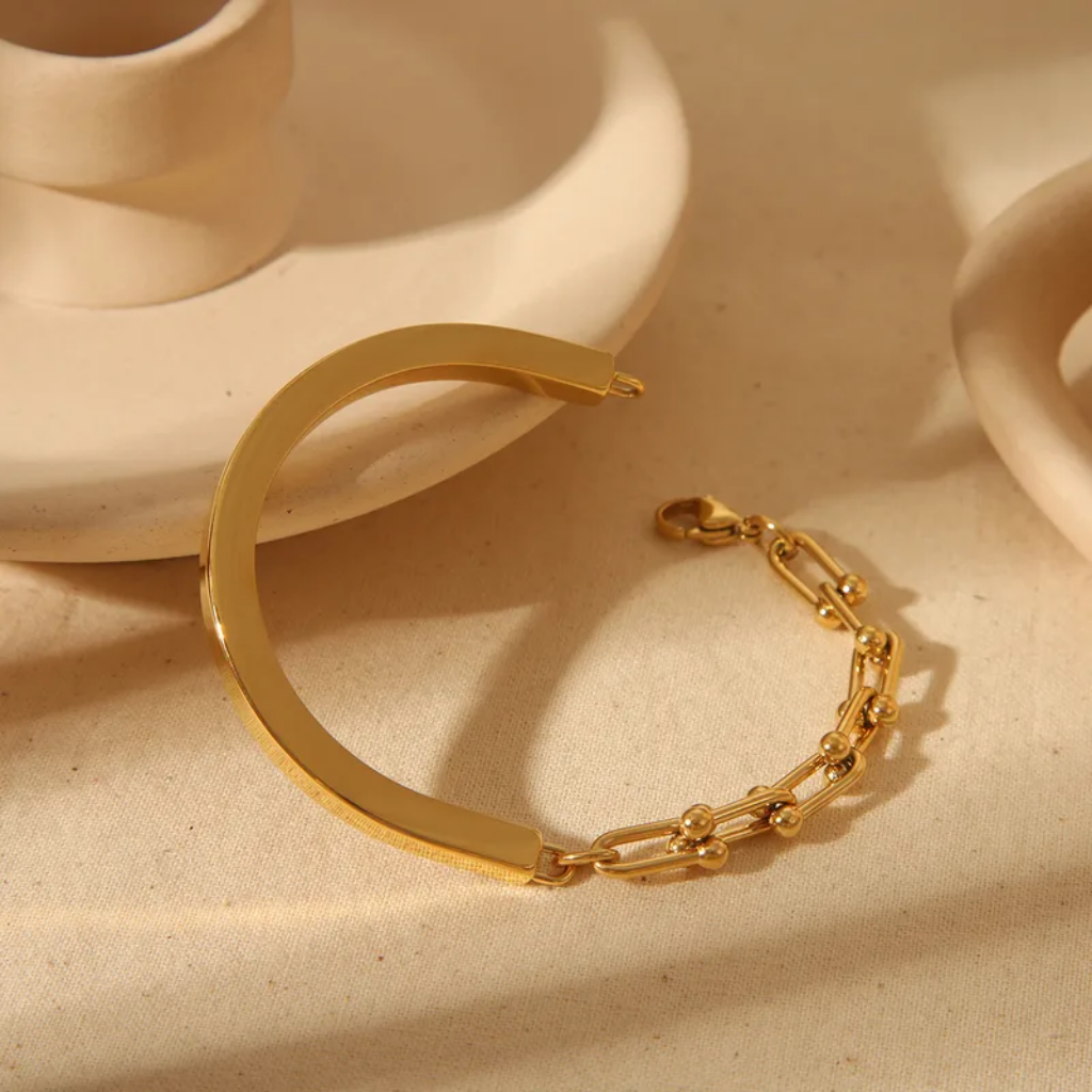 Pulsera en acero inoxidable con chapado en oro de 18K, combinando un lado tipo bangle y otro en cadena para un diseño único. Perfecta para uso diario, combinaciones creativas y looks de fin de semana con estilo.