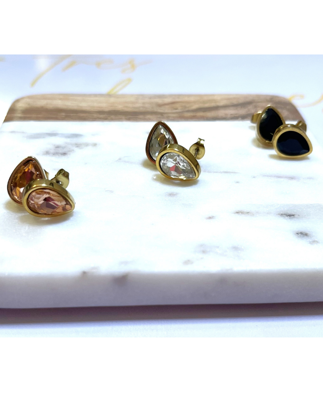 Pantallas en acero inoxidable chapadas en oro de 18K, con piedra brillante. Elegantes y versátiles, perfectas para el trabajo o una salida especial — desde Light Monday hasta Weekend Vibe.
