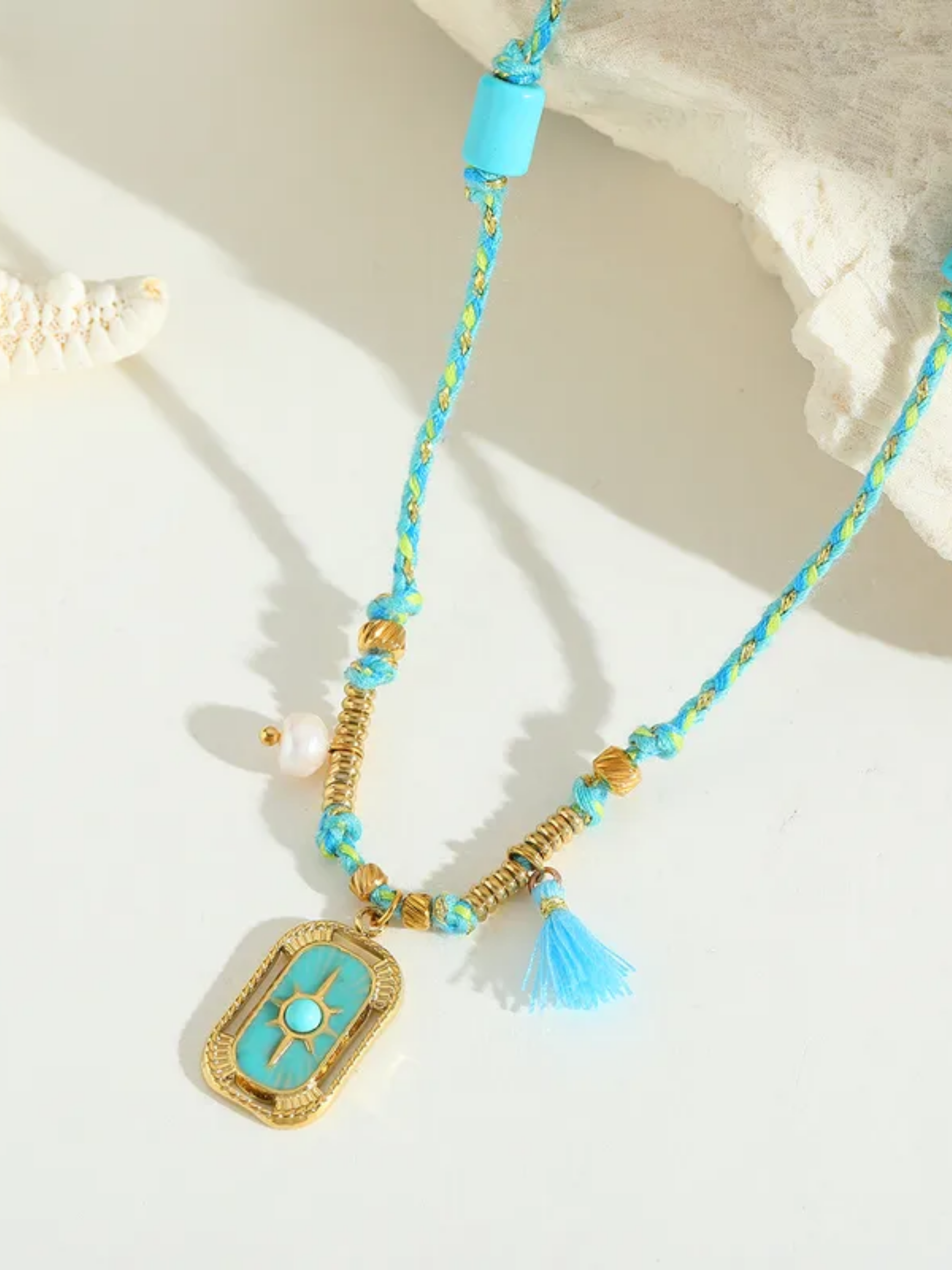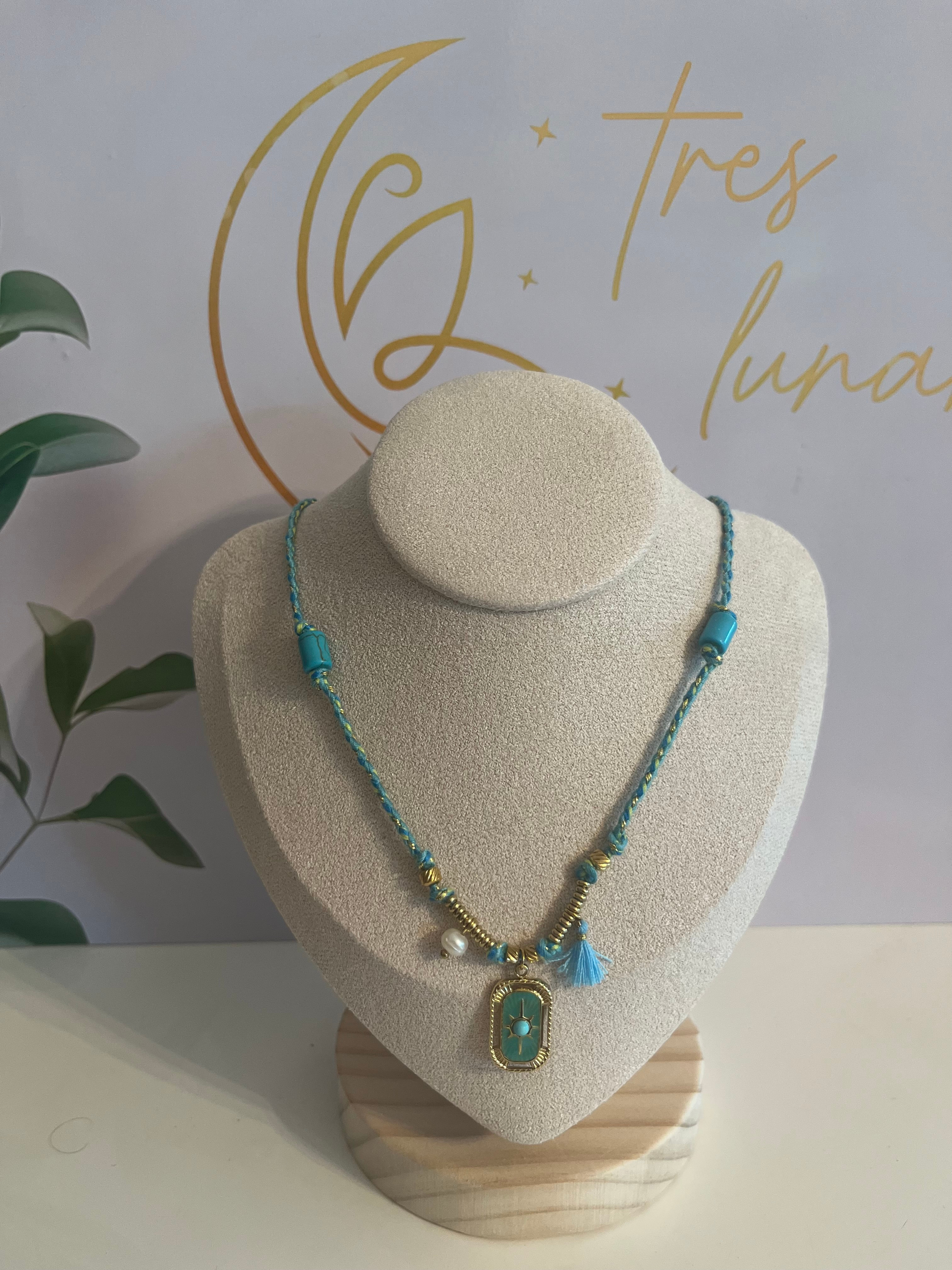 Collar delicado en hilo con detalles en acero inoxidable y baño de oro 14K. Una pieza versátil y ligera que aporta sutileza y brillo a tu look diario o salidas de fin de semana.