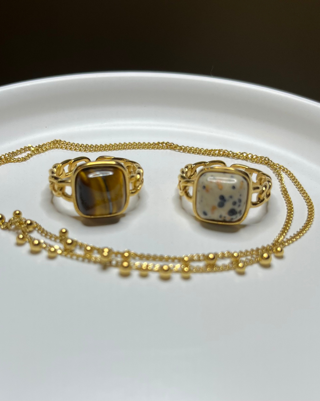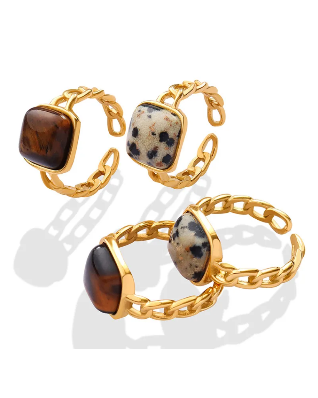 Sortija en acero inoxidable chapada en oro de 18K, con piedra natural. Dos estilos, una misma esencia: perfecta para el diario, una salida o ese glow entre semana.