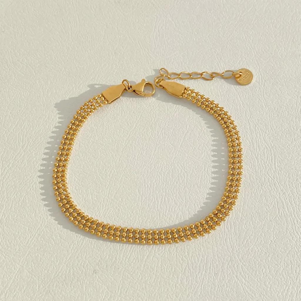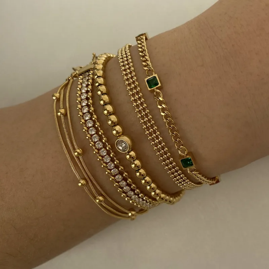 Es un 3 en una, pulsera ajustable, delicadas en acero inoxidable con chapado en oro de 18K. Versátil y fina, perfecta para usar a diario, combinar y dar un toque elegante a tu look de fin de semana.