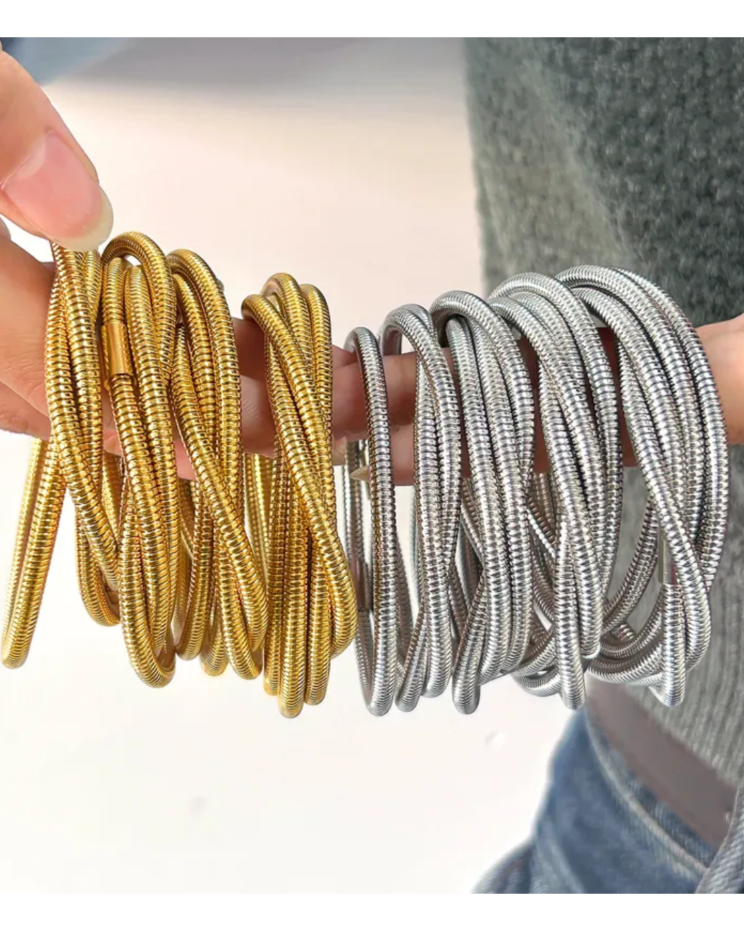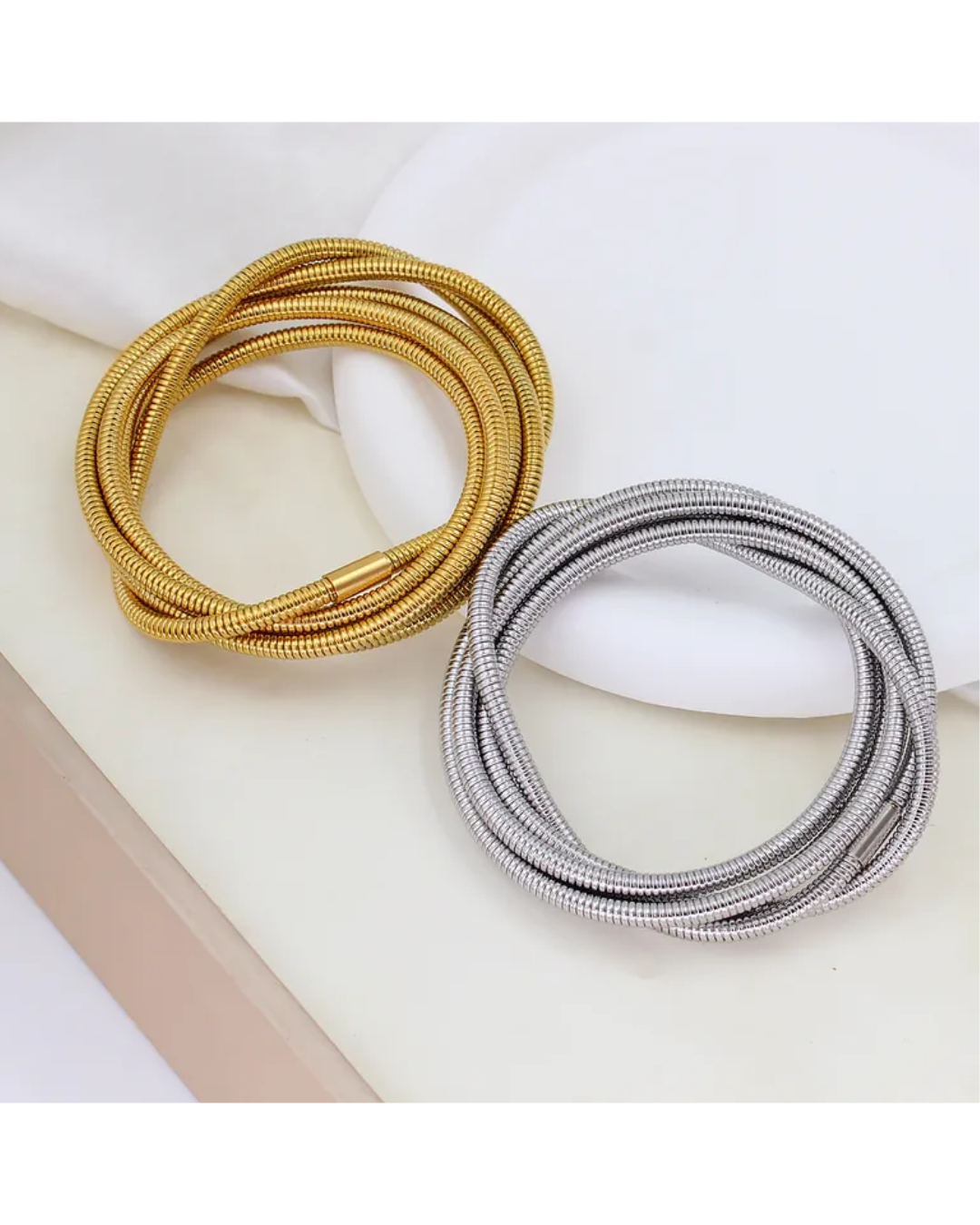 Pulsera en acero inoxidable chapada en oro de 18K, con diseño entrelazado moderno y magnético. Un básico elegante para elevar tu estilo diario o acompañarte con flow en cada salida.