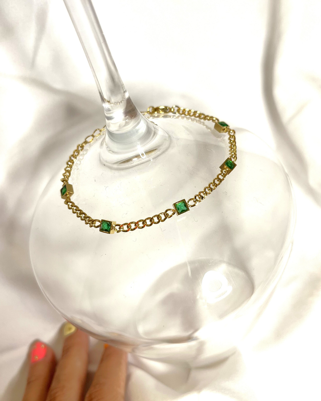 Pulsera en acero inoxidable chapada en oro de 18K, con detalle verde que aporta elegancia y frescura. Ideal para días de trabajo o salidas con estilo — Midweek Glow o Weekend Vibe.
