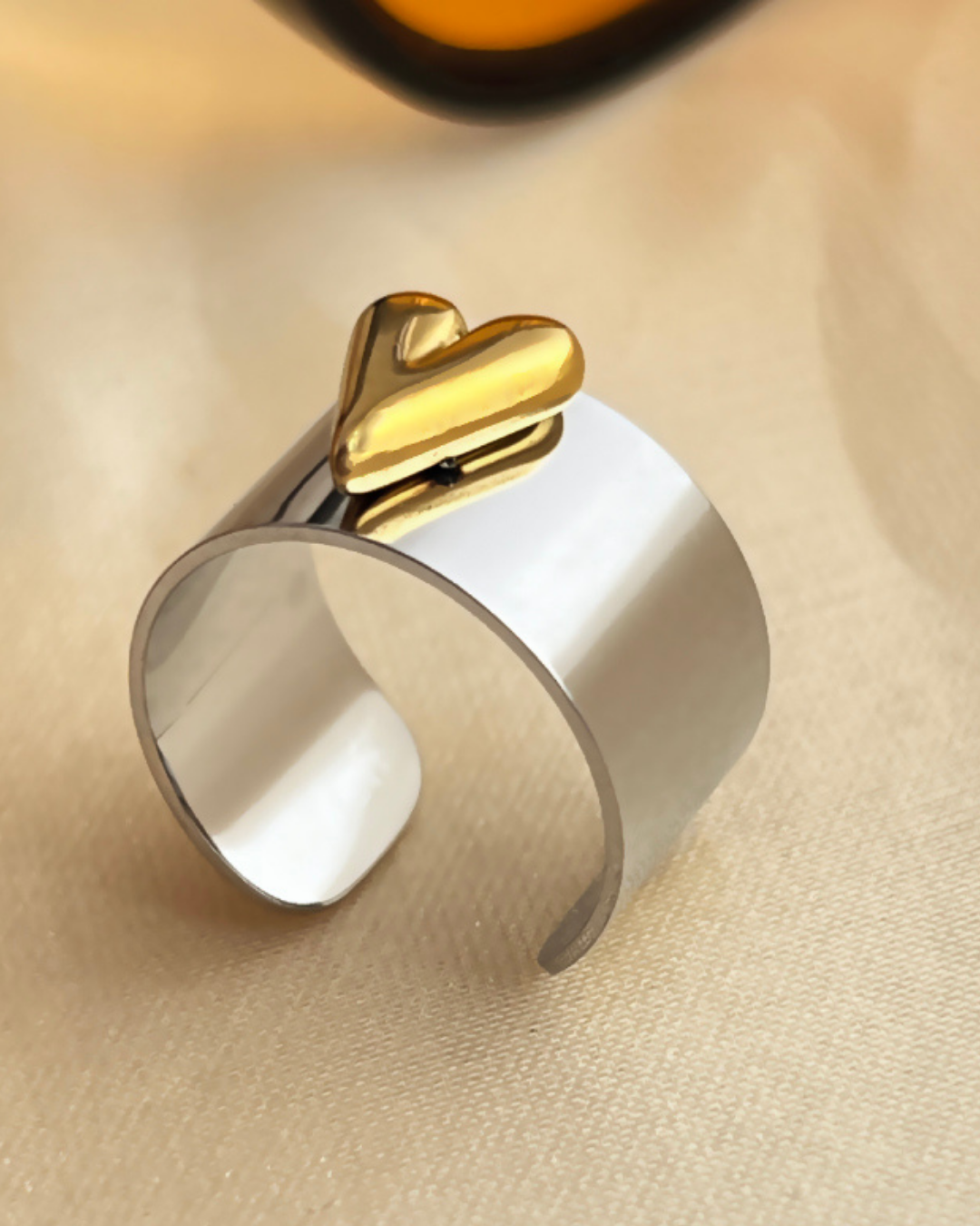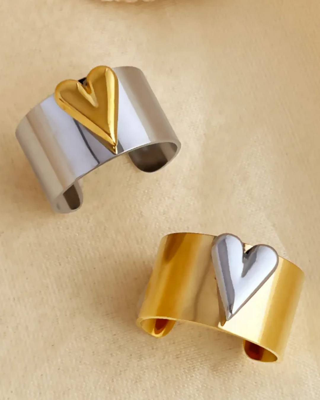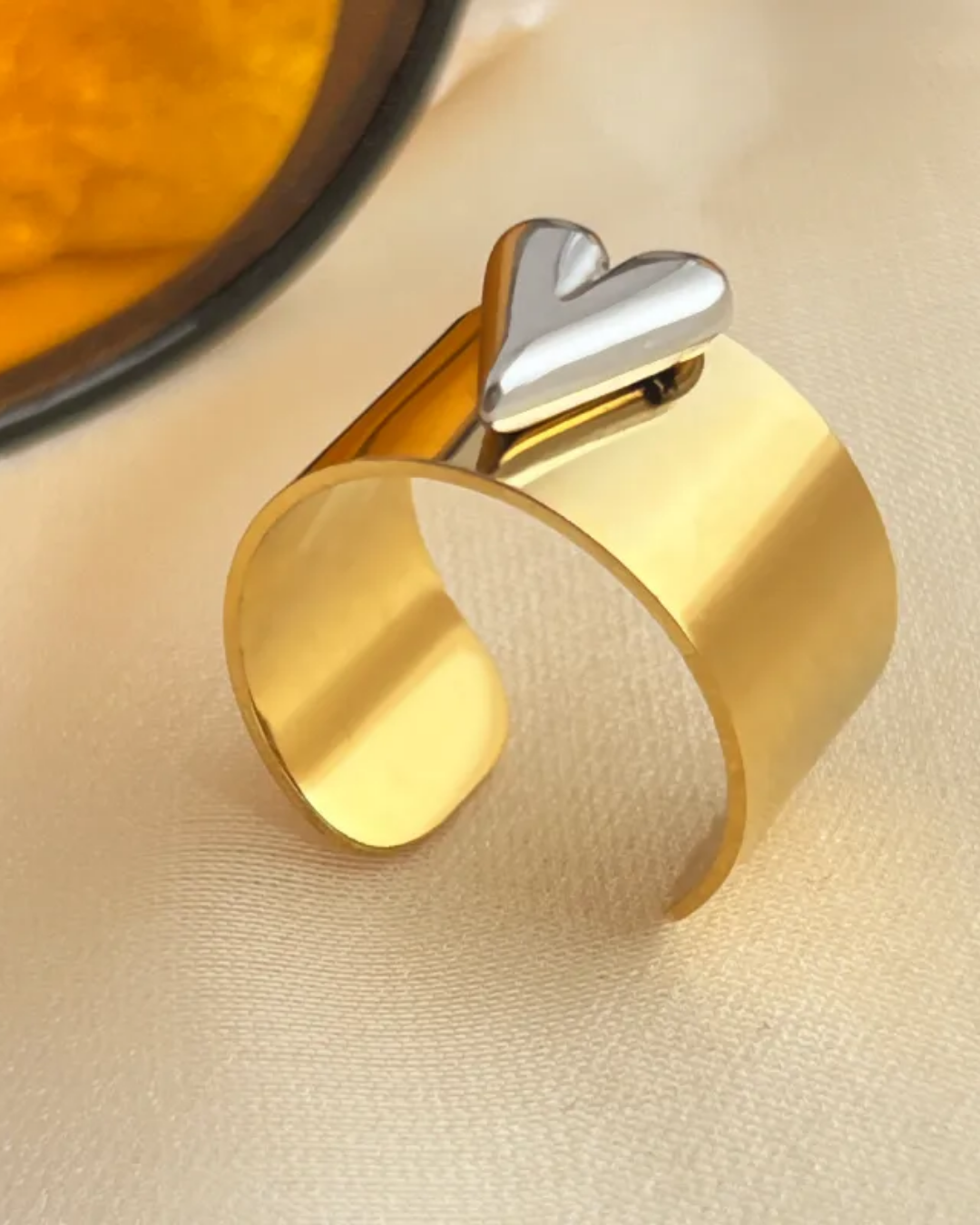 Sortija en acero inoxidable chapada en oro de 18K, con diseño de corazón en relieve. Un toque delicado y con intención, ideal para salidas, días de trabajo o tu vibra de Midweek Glow y Weekend Vibe.