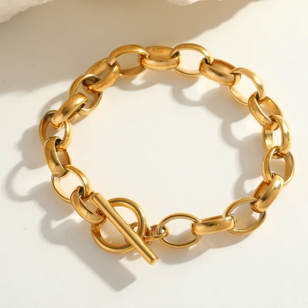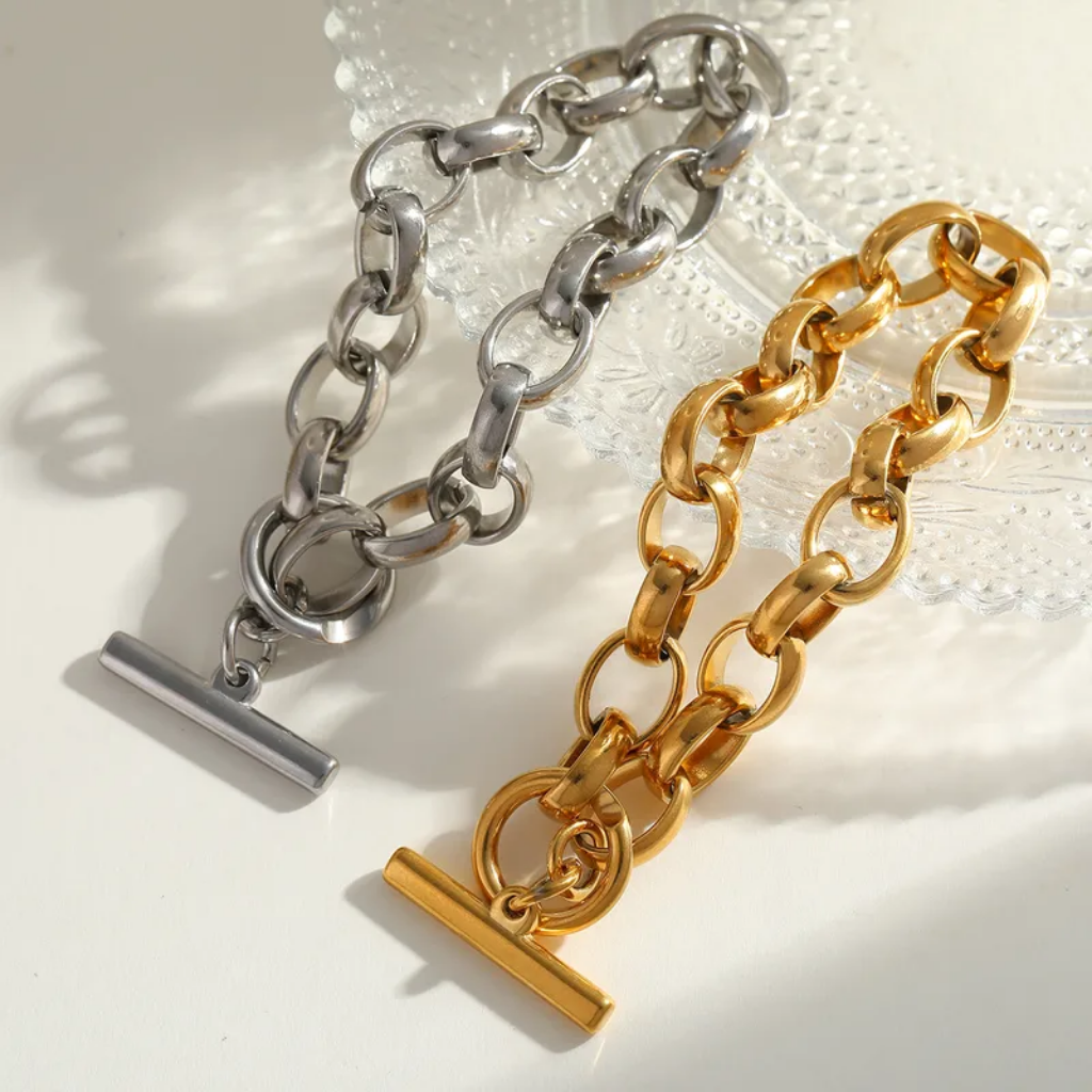 Pulsera tipo cadena en acero inoxidable con chapado en oro de 18K, disponible en color dorado y plateado. Un diseño versátil y notable, perfecto para uso diario, combinaciones creativas y looks casuales con personalidad.