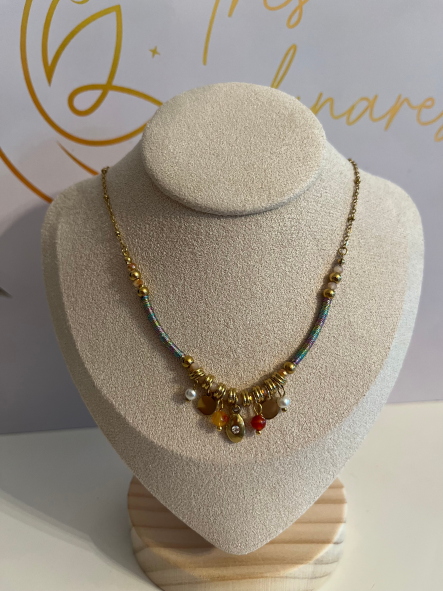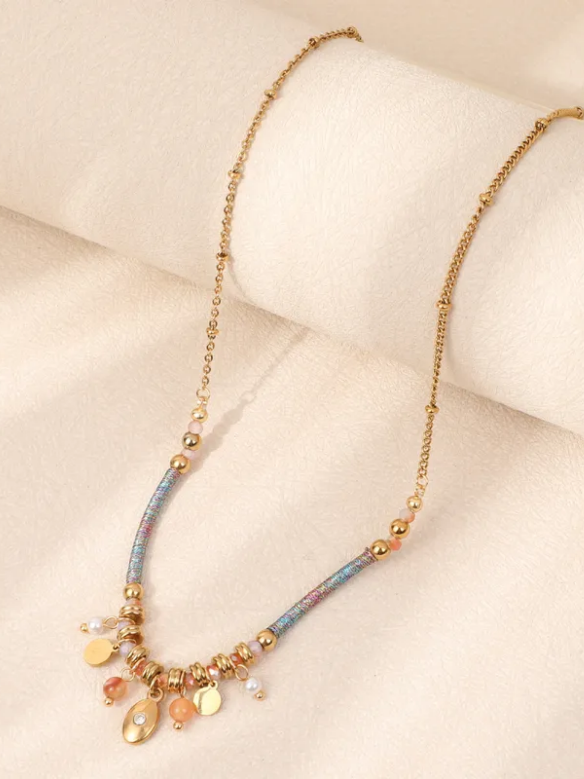 Collar en acero de titanio enchapado, con sutiles toques de color que aportan un brillo único. Ideal para elevar tu estilo con elegancia, desde el trabajo hasta una noche de fiestas.