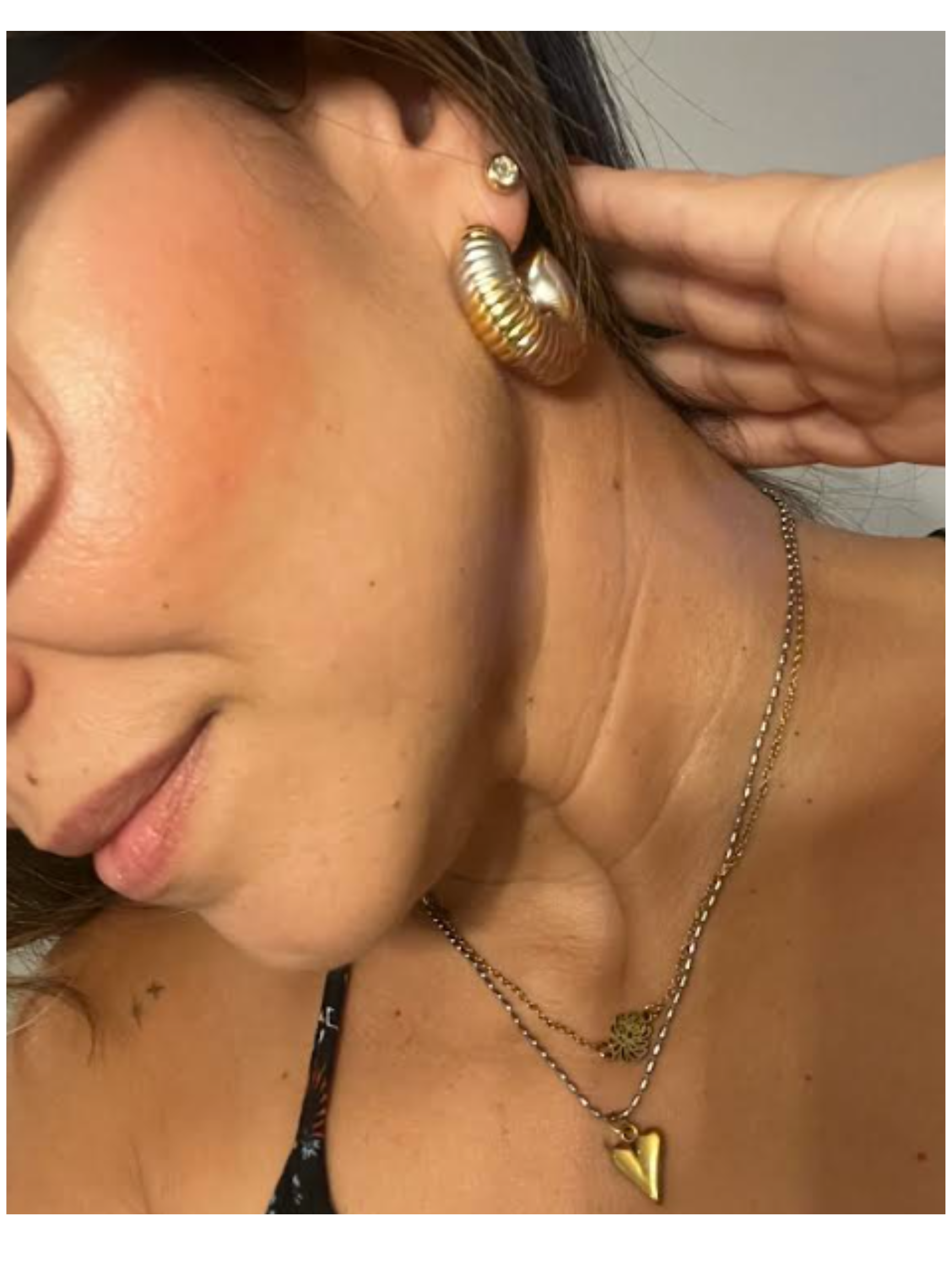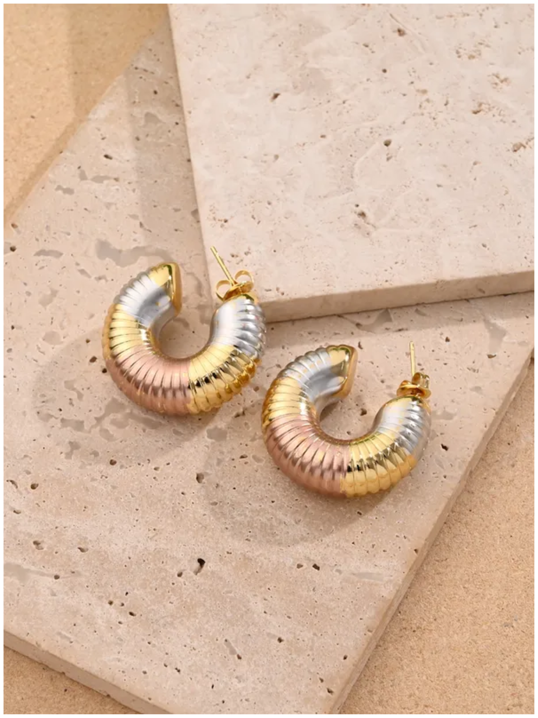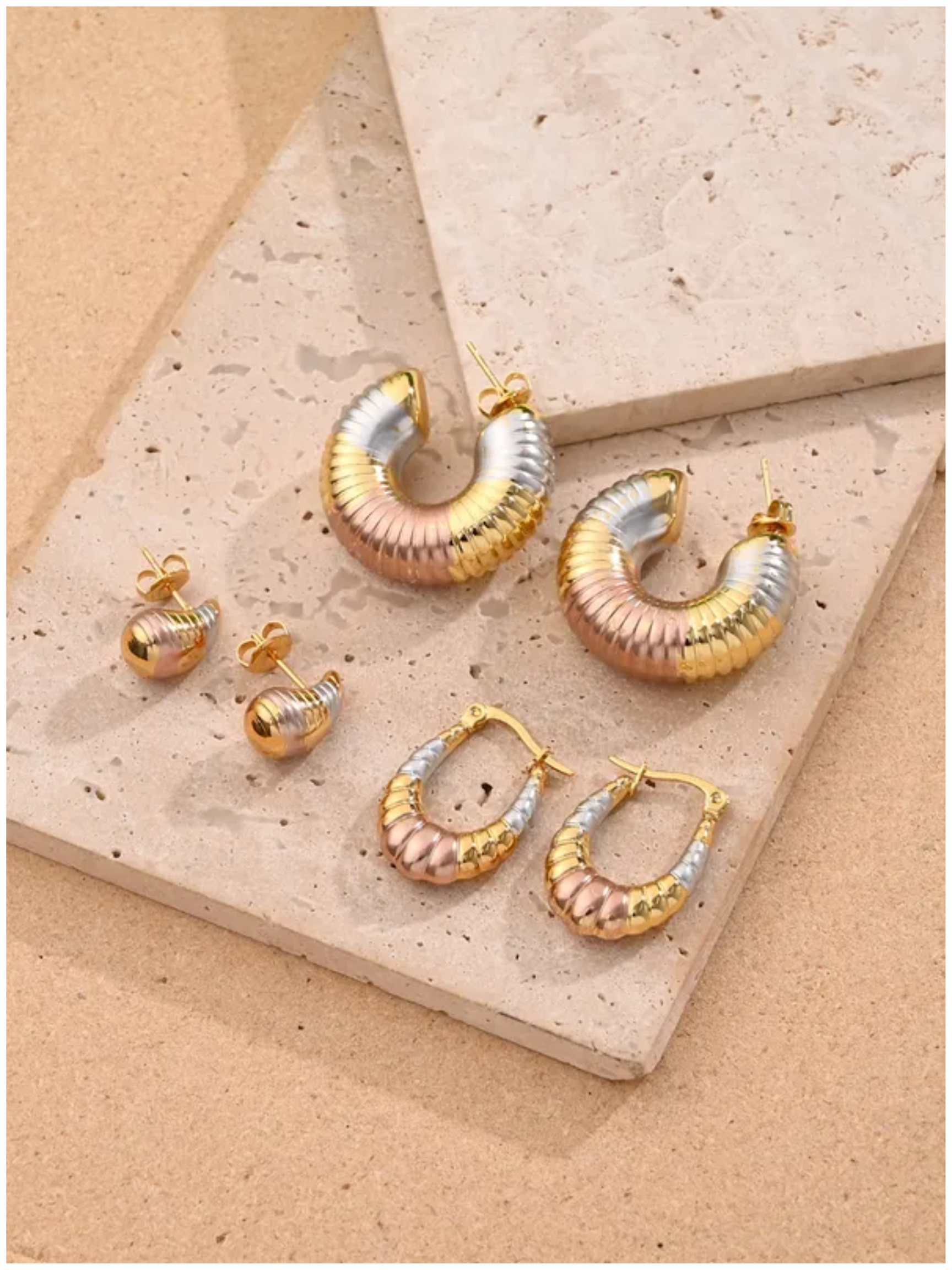 Pantallas gruesas pero livianas en acero inoxidable 304 con enchapado tricolor: oro, plata y oro rosado. Una pieza audaz y versátil que resalta tu estilo con elegancia