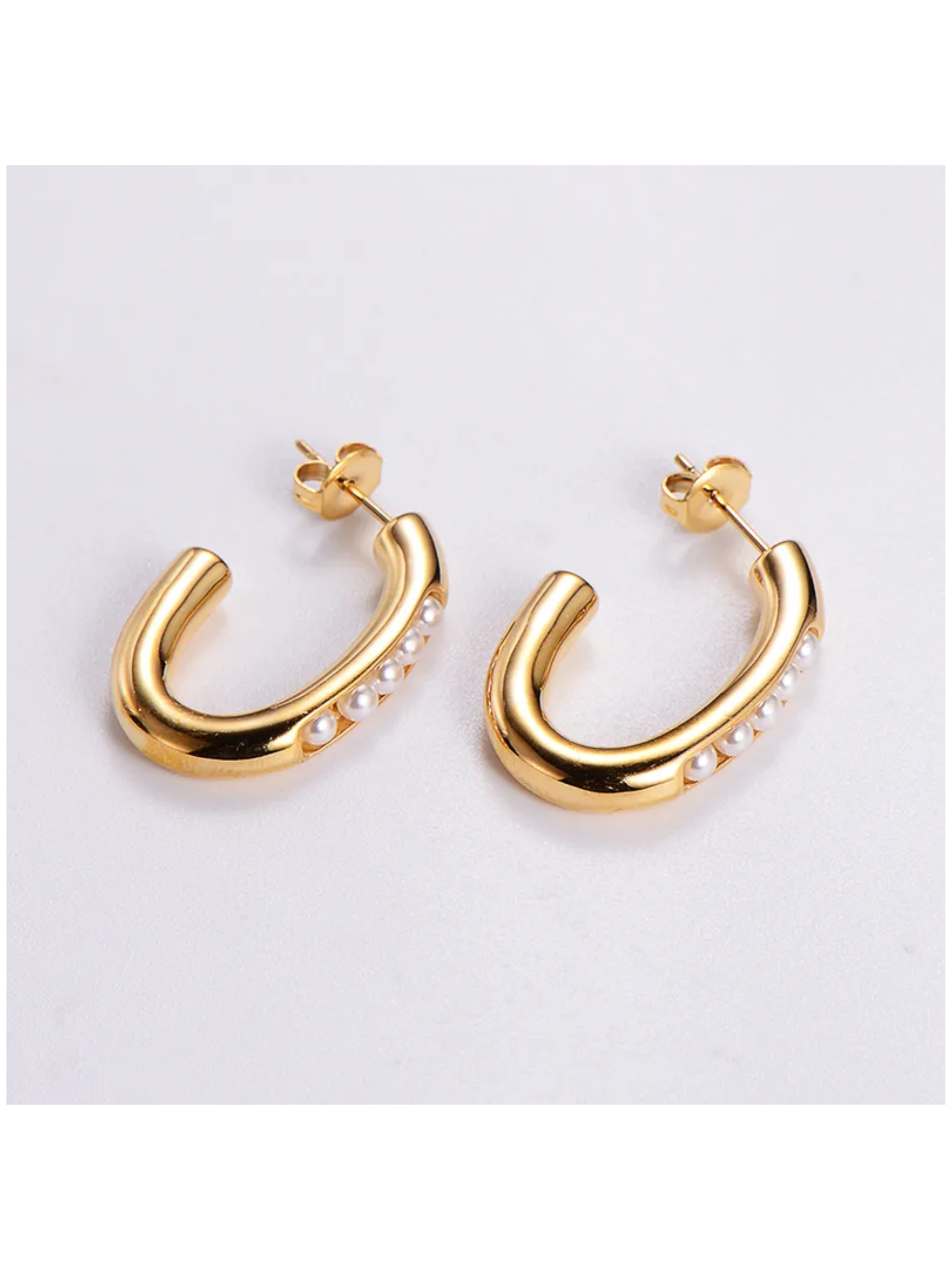 Pantallas colgantes en acero inoxidable con enchapado en oro de 24K y perlas en el centro que capturan todas las miradas. Un diseño sofisticado y radiante que eleva tu estilo con un toque de lujo atemporal.