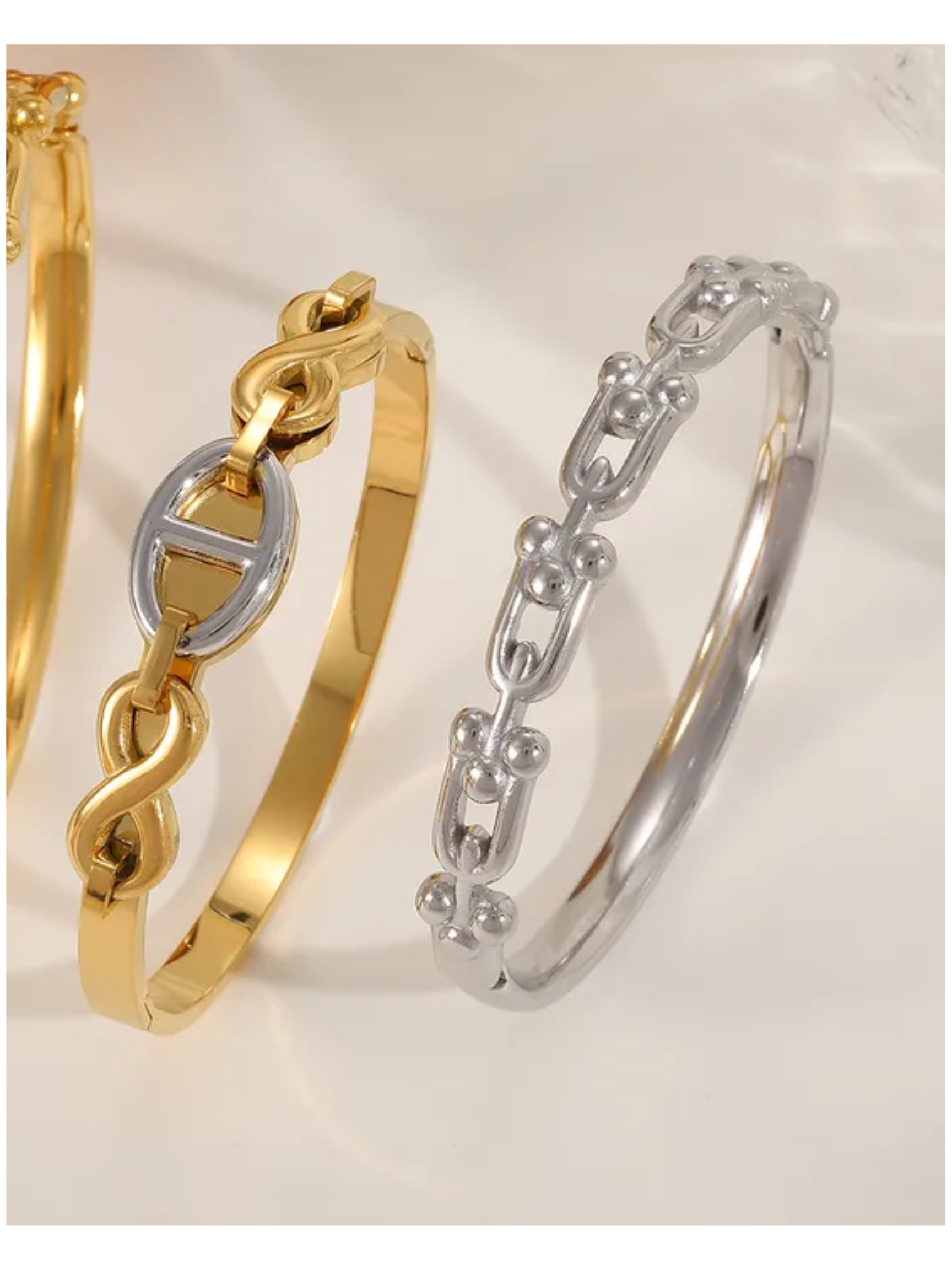 Pulsera en acero inoxidable 304 chapado en oro de 18K con detalle plateado en la parte superior. Su diseño moderno y contrastado la convierte en un complemento versátil y sofisticado para cualquier ocasión.
