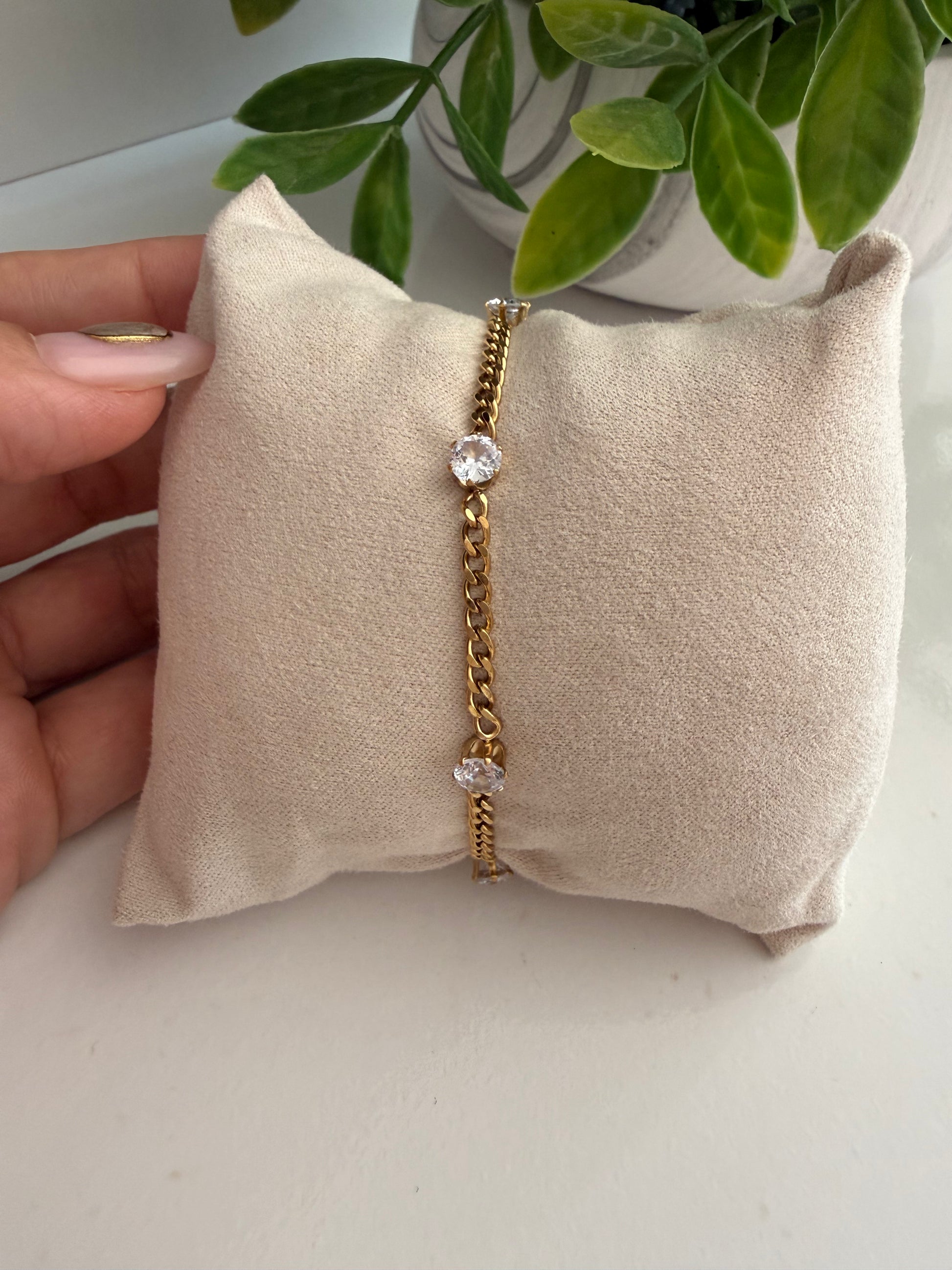 Pulsera en acero inoxidable enchapado en oro. Delicada, hermosa con extensión para distintos tamaños. Tiene cuatro detalles simulando diamantes que le dan ese brillo llamativo.