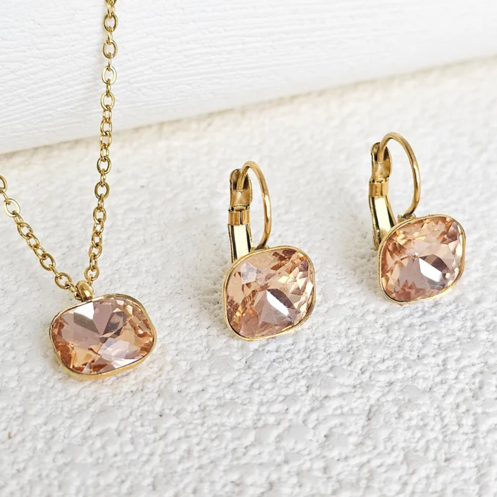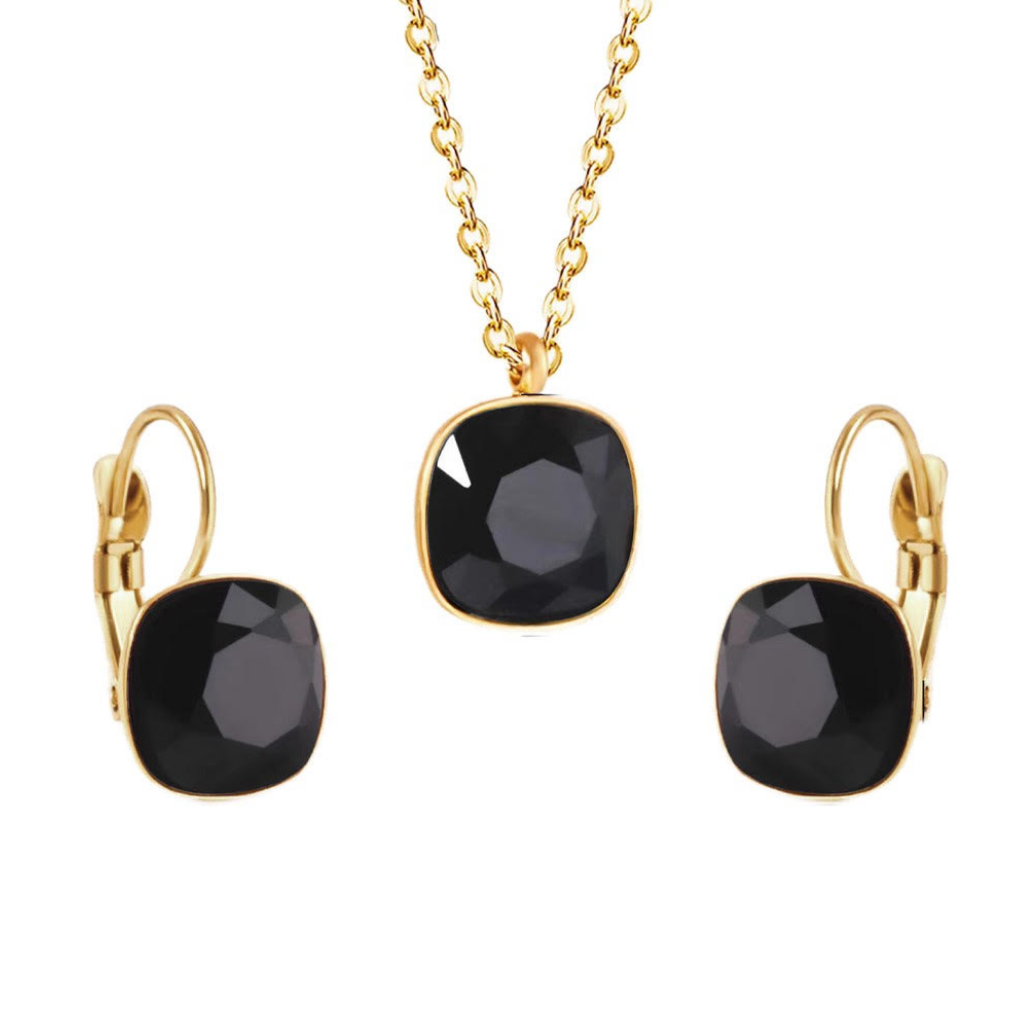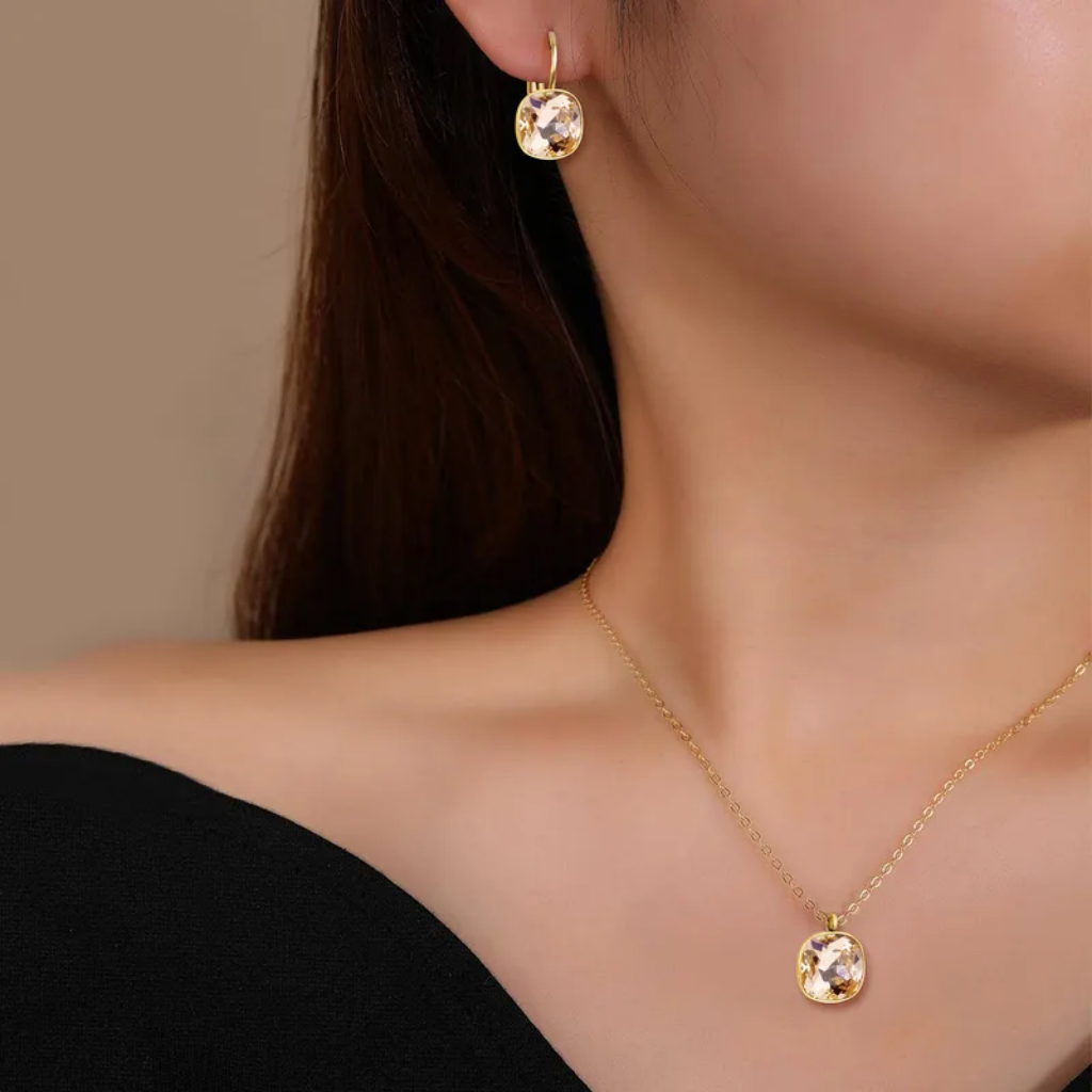 Set de collar y pantallas en acero inoxidable con baño de oro 18K, decorado con brillo en el centro a modo de charm. Un diseño fino y sofisticado que aporta distinción a cualquier look, del trabajo a la fiesta.