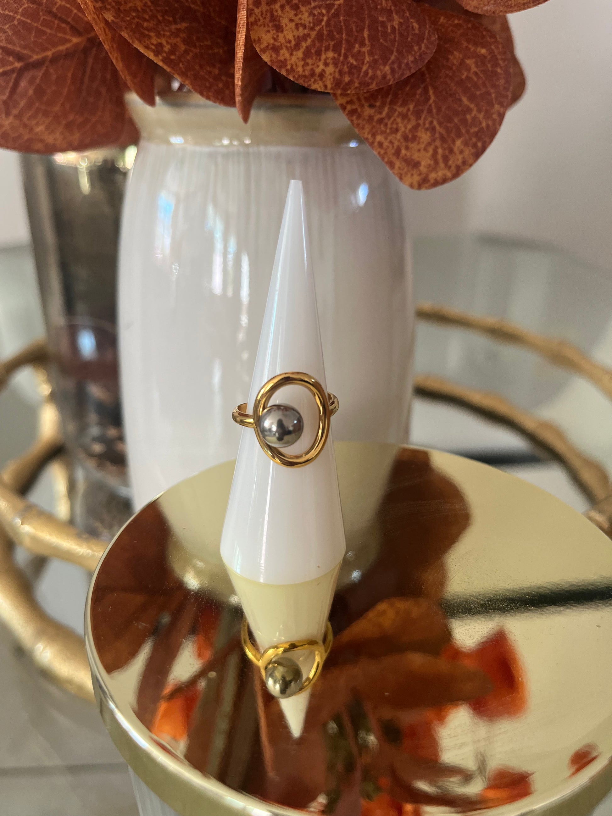 Sortija dos tonos en acero inoxidable, con detalle circular plateado distintivo! ajustable!. Combínala y llévala de lunes a domingo.