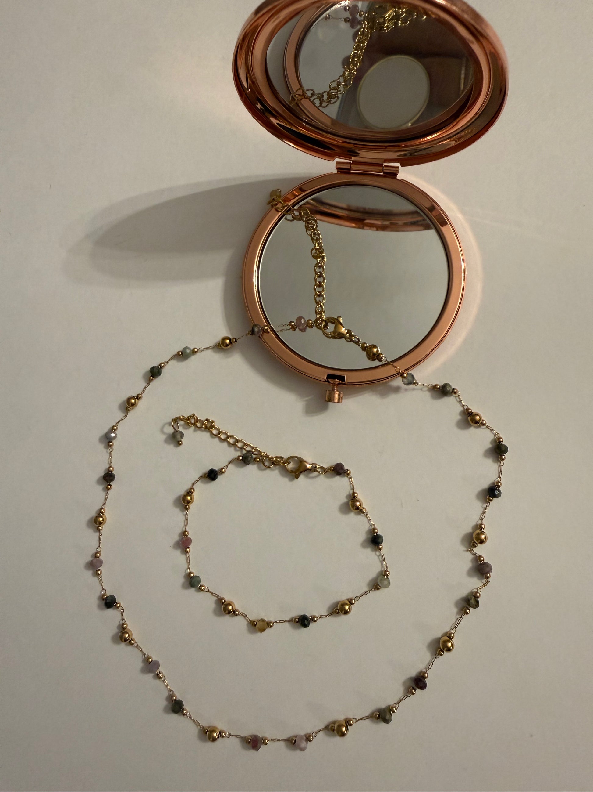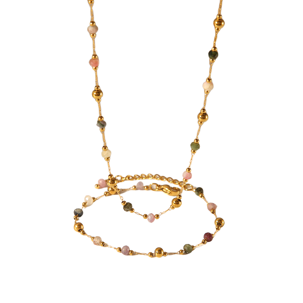 Set de collar y pulsera en piedras naturales, acero inoxidable, enchapado en oro 18k. Set perfecto para dejarlo sentir toda la semana y combinarlo con otros collares y será el que de ese toque colorido sutil.
